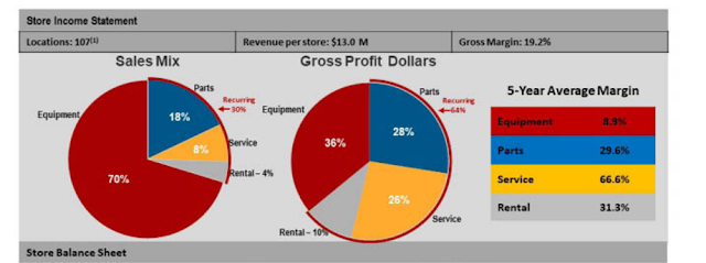 Ungefär två tredjedelar består av maskinförsäljning så vid en första anblick ser verksamheten ut att vara utelämnad åt sitt öde, men vi vet att eftermarknad är något som tenderar att vara betydligt mer lönsamt. Övriga intäkter är nästan uteslutande hänförligt till Contracting services vilket innebär att Ferronordic gör allt arbete åt en kund med att exempelvis frakta jord från punkt A till punkt B och sedan betalar kunden per ton levererat material. Ferronordic särredovisar inte hur mycket av vinsten som kommer från respektive affärsområden, men det finns andra återförsäljare av anläggningsmaskiner vi kan titta på för att få en fingervisning. En sådan är Titan Machinery i jänkarstaterna. I pajdiagrammet nedan kan vi se deras försäljning och lönsamhet. En tumregel för återförsäljare vilket Titan Machinery följer relativt väl är att intäkterna från reservdelar är ungefär dubbelt så stora som intäkterna från service men att marginalerna i stället är ungefär dubbelt så höga i häradet 60 procent. Räknar vi ned servicemarginalen lite för att ta höjd för de stora avstånden i Ryssland osv till 60 procent får vi en viktad bruttomarginal för eftermarknadsaffären om 1/3 x 60 % (för service) + 2 / 3 x 30 % (för reservdelar) = 40 procent. Contracting services kan vi anta har en liknande marginal då alla anläggningstillgångar osv är på Ferronordics balansräkning. Låt oss anta 10 procent marginal på nyförsäljning av maskiner, vilket är ganska typiskt för branschen och i linje med Titan Machinery.